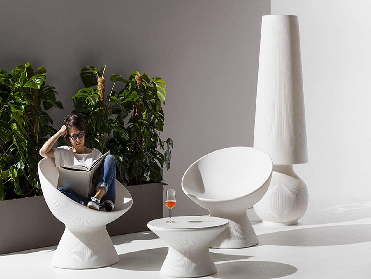 Ova fotelja ima uglađene linije i jedinstvenu prugastu površinu sa posebnim završnim obradama koje podsjećaju na prirodne materijale.